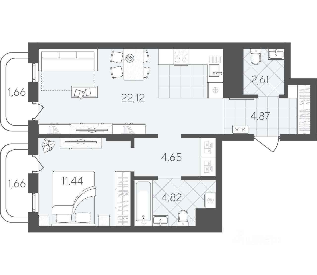 В квартире есть кухня-гостиная и отдельная спальня, предусмотрены ниши под шкафы-купе. Это позволяет оставить больше пространства для жизни.