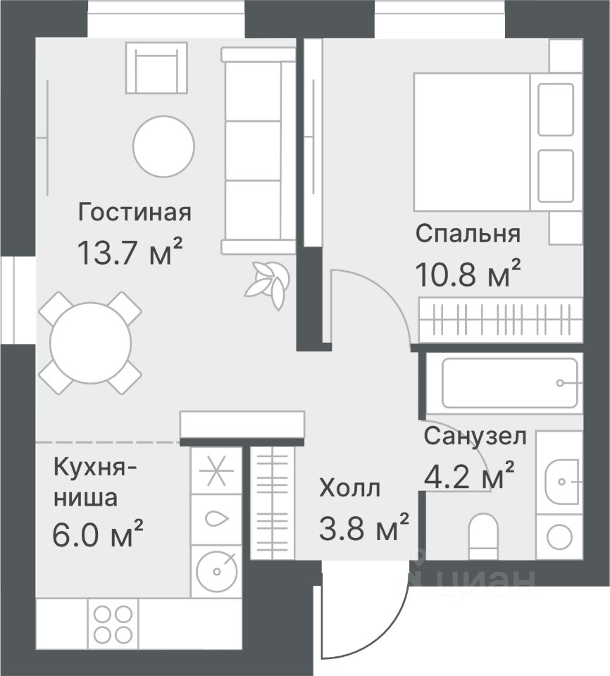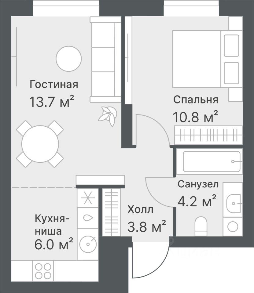 Европейская планировка: просторная кухня-гостиная с обособленной зоной для готовки. В спальне есть ниша для шкафа в углублении стены. В прихожей тоже есть ниша для шкафа.