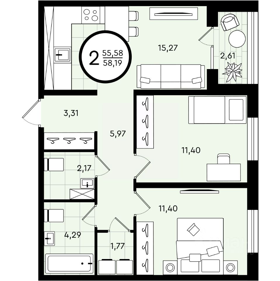Общая площадь58,19 м²