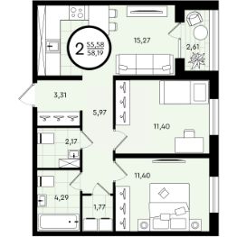 Продается 2-комн. квартира, 58,19 м²
