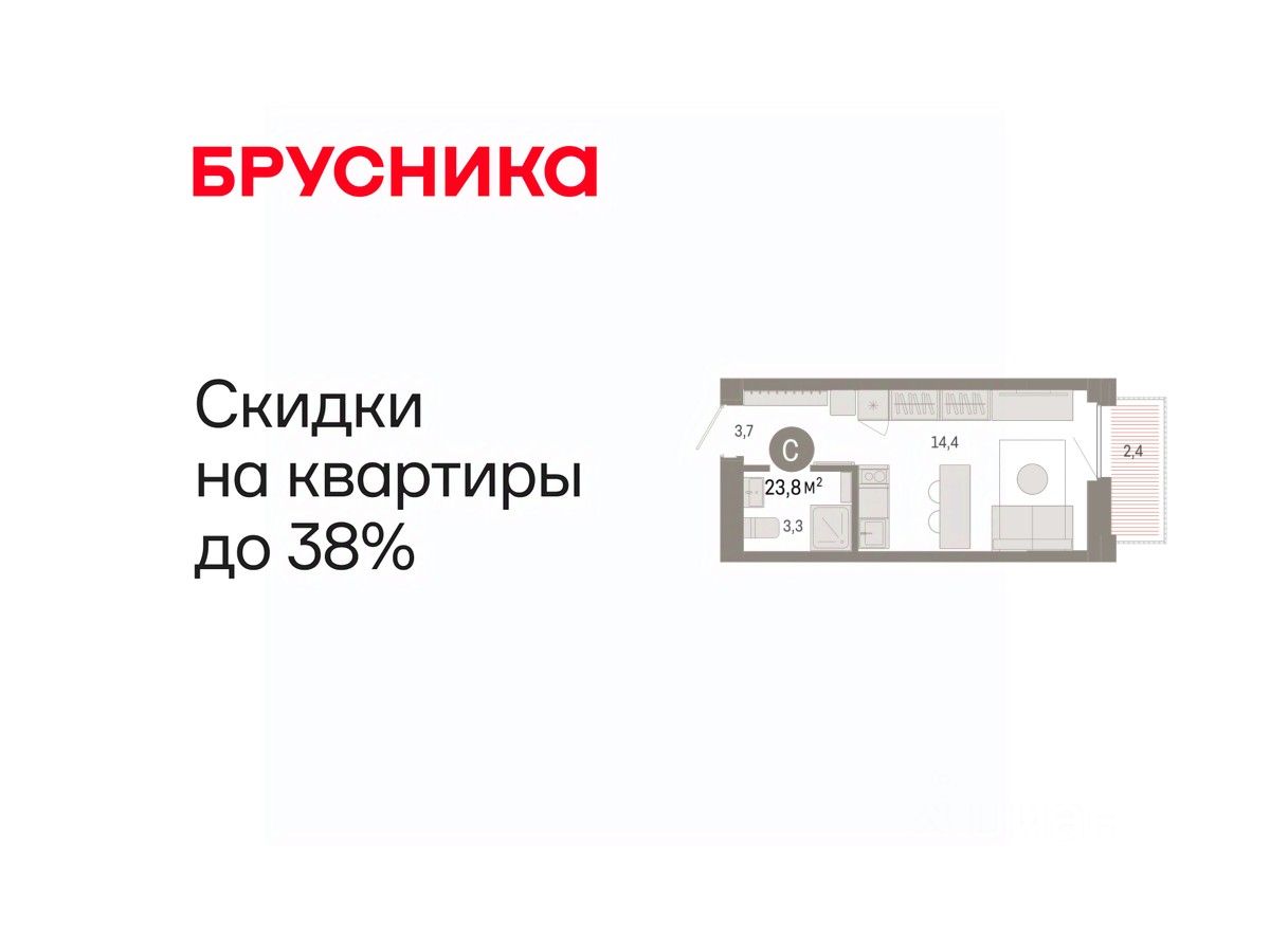 Продается 1-комн. студия с предчистовой отделкой в ЖК "Зарека" на 6 этаже. Общая площадь: 23.82 кв.м., площадь гостиной 14.4 кв.м., из которых 5 кв.м. выделено под кухонную зону. Все окна выходят на одну сторону. В квартире один балкон, один совмещенный санузел. Высота потолков 2.7 м.