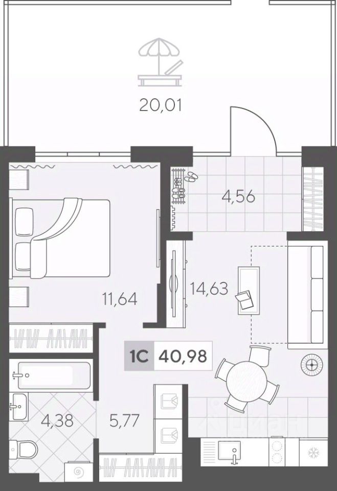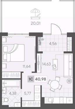 Однокомнатная квартира 40.98 кв.м на 1 этаже с просторной кухней-гостиной. Здесь легко создать уютное пространство для встреч, а отдельная спальня обеспечивает комфорт и личное пространство..