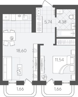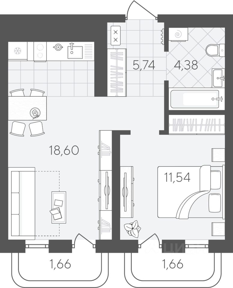 В квартире есть кухня-гостиная и отдельная спальня, предусмотрены ниши под шкафы-купе. Это позволяет оставить больше пространства для жизни.