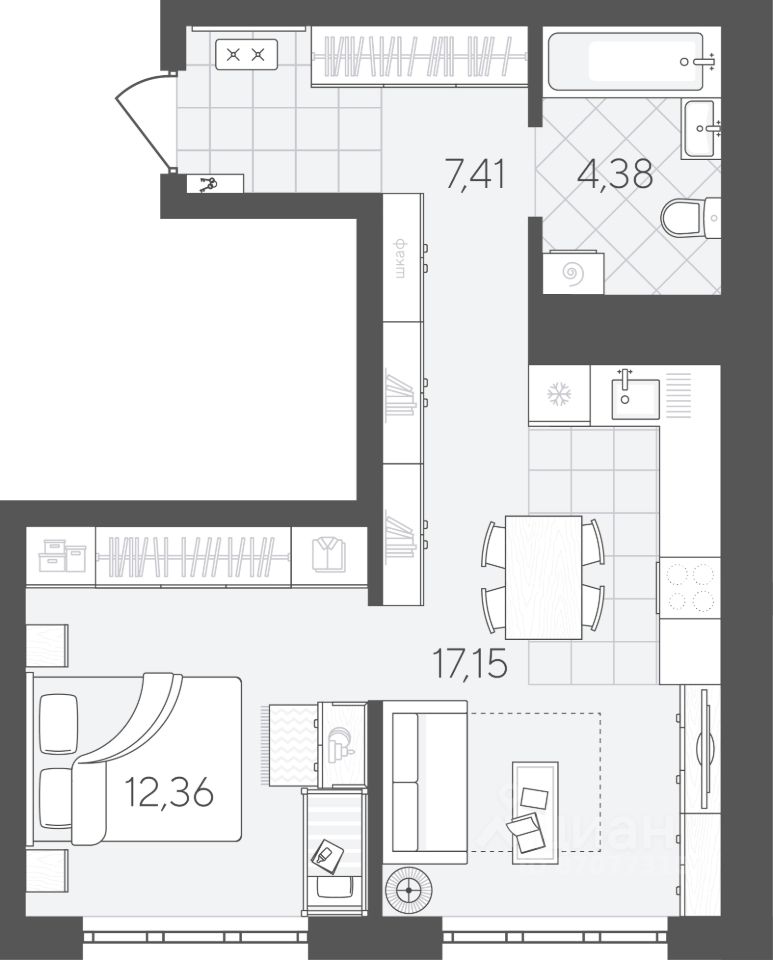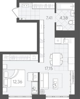 В квартире есть кухня-гостиная и отдельная спальня, предусмотрены ниши под шкафы-купе. Это позволяет оставить больше пространства для жизни.