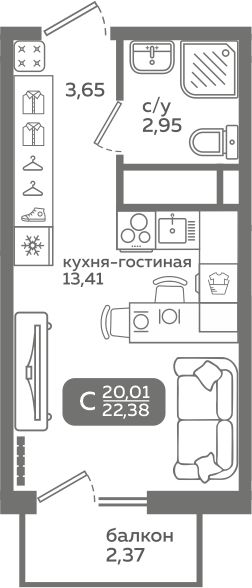 Прямая продажа от застройщика! Продается студия в строящемся ЖК "Меридиан Слобода", срок сдачи: I-кв. 2027, общей площадью 20.01 м², на 7 этаже из 21. Площадь кухни — 13.41 м².