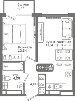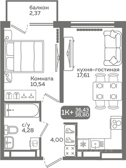 Прямая продажа от застройщика! Продается однокомнатная квартира в строящемся ЖК "Меридиан Слобода", срок сдачи: I-кв. 2027, общей площадью 36.43 м², на 9 этаже из 21. Площадь кухни — 17.61 м².