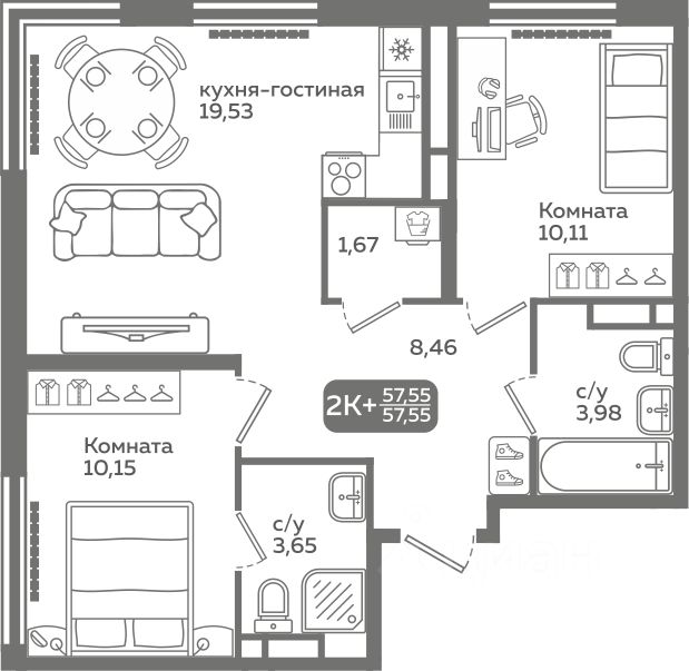 Прямая продажа от застройщика! Продается двухкомнатная квартира в строящемся ЖК "Меридиан Слобода", срок сдачи: I-кв. 2027, общей площадью 57.55 м², на 9 этаже из 21. Площадь кухни — 19.53 м².