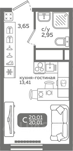 Прямая продажа от застройщика! Продается студия в строящемся ЖК "Меридиан Слобода", срок сдачи: I-кв. 2027, общей площадью 20.01 м², на 10 этаже из 21. Площадь кухни — 13.41 м².
