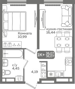 Прямая продажа от застройщика! Продается однокомнатная квартира в строящемся ЖК "Меридиан Слобода", срок сдачи: I-кв. 2027, общей площадью 36.07 м², на 10 этаже из 21. Площадь кухни — 16.44 м².