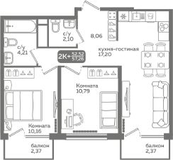 Прямая продажа от застройщика! Продается двухкомнатная квартира в строящемся ЖК "Меридиан Слобода", срок сдачи: I-кв. 2027, общей площадью 52.52 м², на 11 этаже из 21. Площадь кухни — 17.2 м².