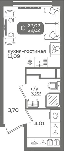 Прямая продажа от застройщика! Продается студия в строящемся ЖК "Меридиан Слобода", срок сдачи: I-кв. 2027, общей площадью 22.02 м², на 15 этаже из 21. Площадь кухни — 11.09 м².