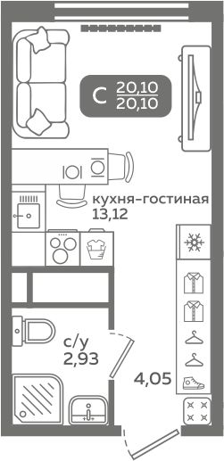 Прямая продажа от застройщика! Продается студия в строящемся ЖК "Меридиан Слобода", срок сдачи: I-кв. 2027, общей площадью 20.1 м², на 16 этаже из 21. Площадь кухни — 13.12 м².