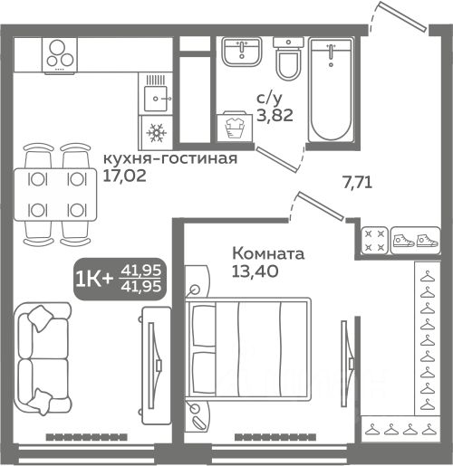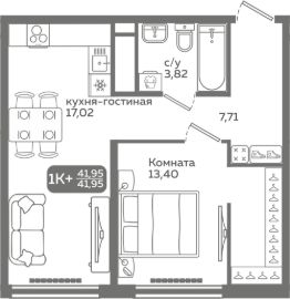 Прямая продажа от застройщика! Продается однокомнатная квартира в строящемся ЖК "Меридиан Слобода", срок сдачи: I-кв. 2027, общей площадью 41.95 м², на 16 этаже из 21. Площадь кухни — 17.02 м².