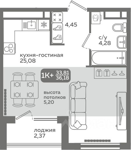 Прямая продажа от застройщика! Продается студия в строящемся ЖК "Меридиан Слобода", срок сдачи: I-кв. 2027, общей площадью 33.81 м², на 16 этаже из 21. Площадь кухни — 25.08 м².