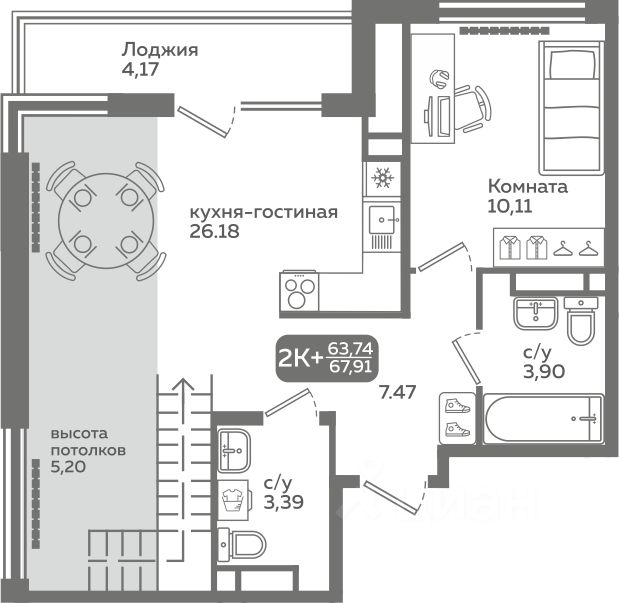 Прямая продажа от застройщика! Продается двухкомнатная квартира в строящемся ЖК "Меридиан Слобода", срок сдачи: I-кв. 2027, общей площадью 63.74 м², на 16 этаже из 21. Площадь кухни — 26.18 м².
