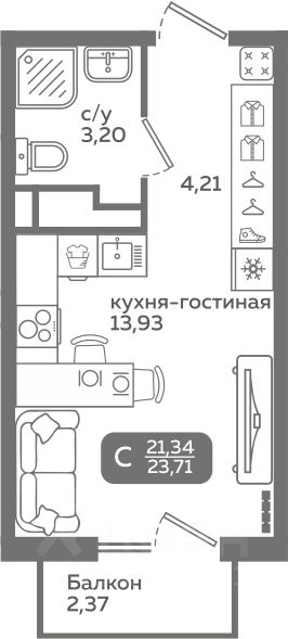 Прямая продажа от застройщика! Продается студия в строящемся ЖК "Меридиан Слобода", срок сдачи: I-кв. 2027, общей площадью 21.34 м², на 3 этаже из 21. Площадь кухни — 13.93 м².
