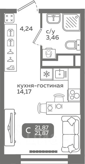Прямая продажа от застройщика! Продается студия в строящемся ЖК "Меридиан Слобода", срок сдачи: I-кв. 2027, общей площадью 21.87 м², на 3 этаже из 21. Площадь кухни — 14.17 м².