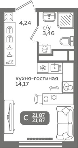 Прямая продажа от застройщика! Продается студия в строящемся ЖК "Меридиан Слобода", срок сдачи: I-кв. 2027, общей площадью 21.87 м², на 4 этаже из 21. Площадь кухни — 14.17 м².