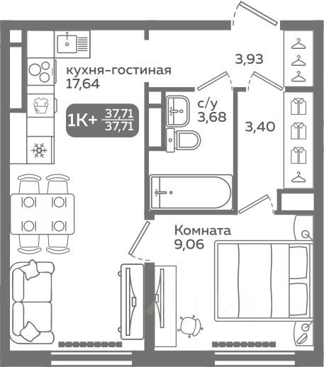 Прямая продажа от застройщика! Продается однокомнатная квартира в строящемся ЖК "Меридиан Слобода", срок сдачи: I-кв. 2027, общей площадью 37.71 м², на 5 этаже из 21. Площадь кухни — 17.64 м².