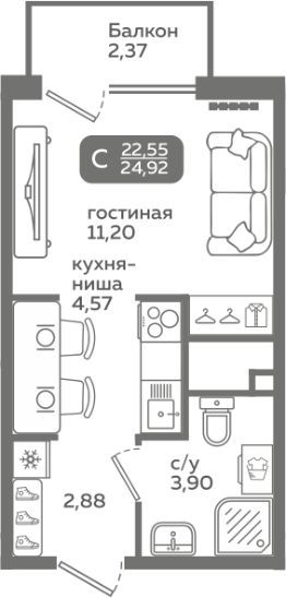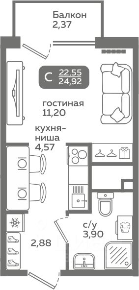Прямая продажа от застройщика! Продается студия в строящемся ЖК "Меридиан Слобода", срок сдачи: I-кв. 2027, общей площадью 22.55 м², на 5 этаже из 21. Площадь кухни — 4.57 м².