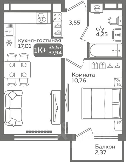 Прямая продажа от застройщика! Продается однокомнатная квартира в строящемся ЖК "Меридиан Слобода", срок сдачи: I-кв. 2027, общей площадью 35.57 м², на 7 этаже из 21. Площадь кухни — 17.01 м².