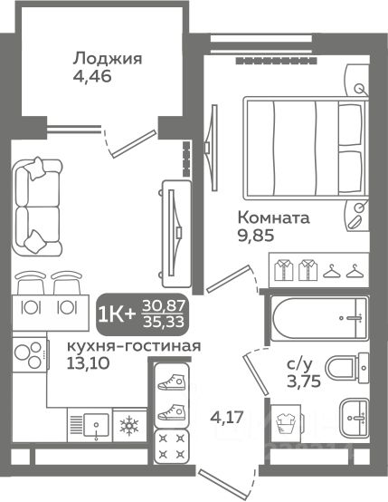 Прямая продажа от застройщика! Продается однокомнатная квартира в строящемся ЖК "Меридиан Слобода", срок сдачи: I-кв. 2027, общей площадью 30.87 м², на 8 этаже из 21. Площадь кухни — 13.1 м².