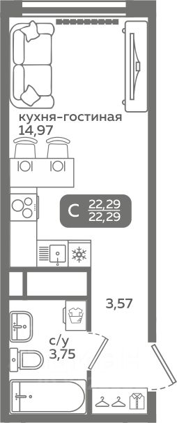 Прямая продажа от застройщика! Продается студия в строящемся ЖК "Меридиан Слобода", срок сдачи: I-кв. 2027, общей площадью 22.29 м², на 9 этаже из 21. Площадь кухни — 14.97 м².