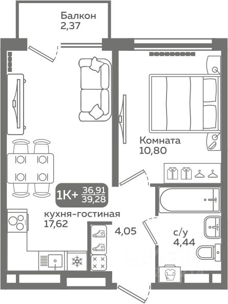 Прямая продажа от застройщика! Продается однокомнатная квартира в строящемся ЖК "Меридиан Слобода", срок сдачи: I-кв. 2027, общей площадью 36.91 м², на 9 этаже из 21. Площадь кухни — 17.62 м².