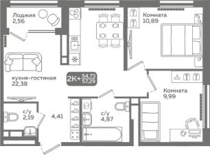 Прямая продажа от застройщика! Продается двухкомнатная квартира в строящемся ЖК "Меридиан Слобода", срок сдачи: I-кв. 2027, общей площадью 57.29 м², на 10 этаже из 21. Площадь кухни — 22.38 м².