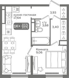 Прямая продажа от застройщика! Продается однокомнатная квартира в строящемся ЖК "Меридиан Слобода", срок сдачи: I-кв. 2027, общей площадью 37.71 м², на 10 этаже из 21. Площадь кухни — 17.64 м².