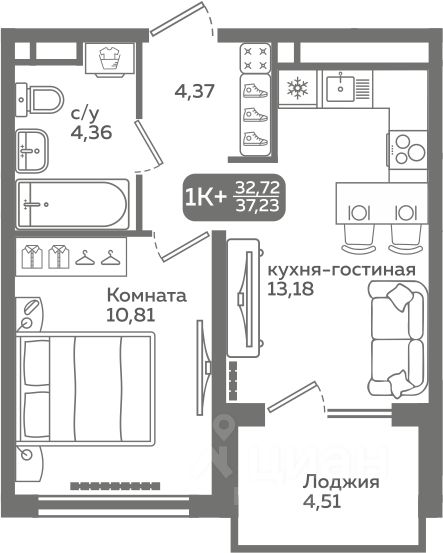 Прямая продажа от застройщика! Продается однокомнатная квартира в строящемся ЖК "Меридиан Слобода", срок сдачи: I-кв. 2027, общей площадью 32.72 м², на 11 этаже из 21. Площадь кухни — 13.18 м².