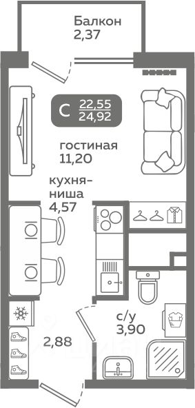 Прямая продажа от застройщика! Продается студия в строящемся ЖК "Меридиан Слобода", срок сдачи: I-кв. 2027, общей площадью 22.55 м², на 11 этаже из 21. Площадь кухни — 4.57 м².