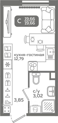 Прямая продажа от застройщика! Продается студия в строящемся ЖК "Меридиан Слобода", срок сдачи: I-кв. 2027, общей площадью 19.66 м², на 13 этаже из 21. Площадь кухни — 12.79 м².
