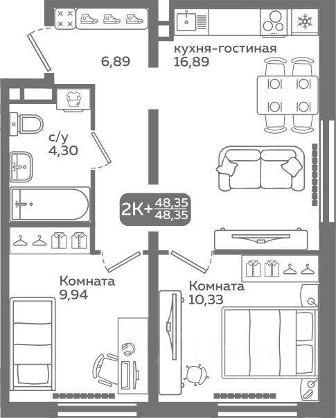 Прямая продажа от застройщика! Продается двухкомнатная квартира в строящемся ЖК "Меридиан Слобода", срок сдачи: I-кв. 2027, общей площадью 48.35 м², на 13 этаже из 21. Площадь кухни — 16.89 м².