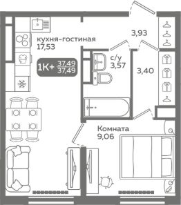 Прямая продажа от застройщика! Продается однокомнатная квартира в строящемся ЖК "Меридиан Слобода", срок сдачи: I-кв. 2027, общей площадью 37.49 м², на 13 этаже из 21. Площадь кухни — 17.53 м².