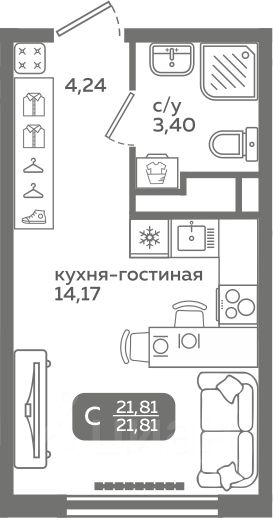 Прямая продажа от застройщика! Продается студия в строящемся ЖК "Меридиан Слобода", срок сдачи: I-кв. 2027, общей площадью 21.81 м², на 13 этаже из 21. Площадь кухни — 14.17 м².