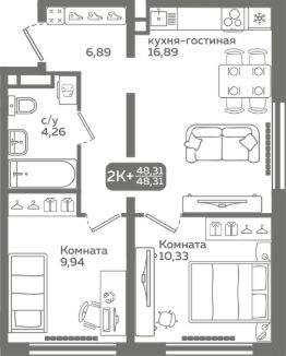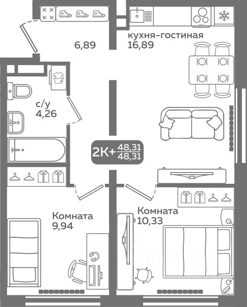 Прямая продажа от застройщика! Продается двухкомнатная квартира в строящемся ЖК "Меридиан Слобода", срок сдачи: I-кв. 2027, общей площадью 48.31 м², на 15 этаже из 21. Площадь кухни — 16.89 м².