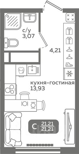 Прямая продажа от застройщика! Продается студия в строящемся ЖК "Меридиан Слобода", срок сдачи: I-кв. 2027, общей площадью 21.21 м², на 15 этаже из 21. Площадь кухни — 13.93 м².