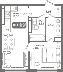 Прямая продажа от застройщика! Продается однокомнатная квартира в строящемся ЖК "Меридиан Слобода", срок сдачи: I-кв. 2027, общей площадью 37.42 м², на 15 этаже из 21. Площадь кухни — 17.5 м².