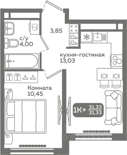 Прямая продажа от застройщика! Продается однокомнатная квартира в строящемся ЖК "Меридиан Слобода", срок сдачи: I-кв. 2027, общей площадью 31.33 м², на 18 этаже из 21. Площадь кухни — 13.03 м².