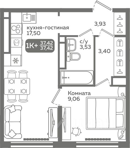 Прямая продажа от застройщика! Продается однокомнатная квартира в строящемся ЖК "Меридиан Слобода", срок сдачи: I-кв. 2027, общей площадью 37.42 м², на 18 этаже из 21. Площадь кухни — 17.5 м².