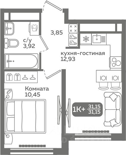 Прямая продажа от застройщика! Продается однокомнатная квартира в строящемся ЖК "Меридиан Слобода", срок сдачи: I-кв. 2027, общей площадью 31.15 м², на 19 этаже из 21. Площадь кухни — 12.93 м².
