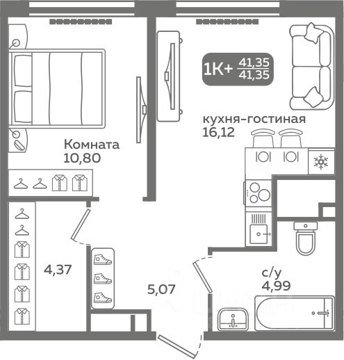 Прямая продажа от застройщика! Продается однокомнатная квартира в строящемся ЖК "Меридиан Слобода", срок сдачи: I-кв. 2027, общей площадью 41.35 м², на 19 этаже из 21. Площадь кухни — 16.12 м².
