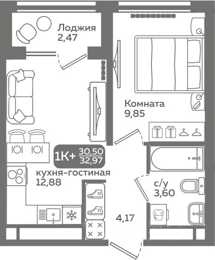 Прямая продажа от застройщика! Продается однокомнатная квартира в строящемся ЖК "Меридиан Слобода", срок сдачи: I-кв. 2027, общей площадью 32.97 м², на 19 этаже из 21. Площадь кухни — 12.88 м².