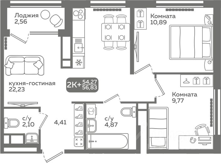 Прямая продажа от застройщика! Продается двухкомнатная квартира в строящемся ЖК "Меридиан Слобода", срок сдачи: I-кв. 2027, общей площадью 56.83 м², на 20 этаже из 21. Площадь кухни — 22.23 м².