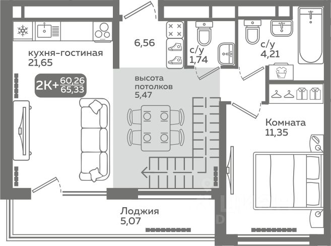 Прямая продажа от застройщика! Продается двухкомнатная квартира в строящемся ЖК "Меридиан Слобода", срок сдачи: I-кв. 2027, общей площадью 60.26 м², на 21 этаже из 21. Площадь кухни — 21.65 м².