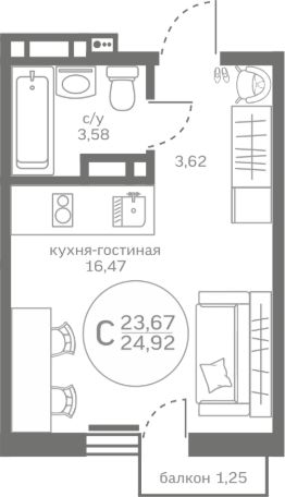 Прямая продажа от застройщика! Продается студия в строящемся ЖК "Меридиан ЮГ". Общая площадь — 23.67 м², на 14 этаже из 17. Площадь кухни — 16.47 м².
