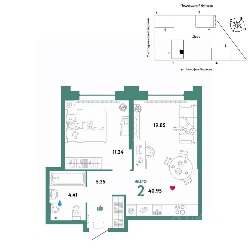 Продается 2комнатная квартира от застройщика "Страна Девелопмент". Стоимость указана без учета акций. Квартира на 14 этаже, площадь квартиры 40,95 кв. м. Сдача — в 3 квартале 2025 года.