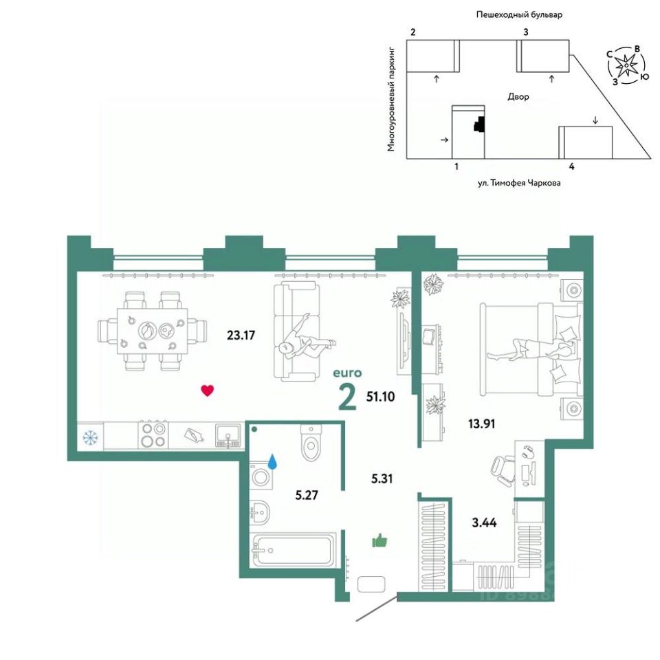 Продается 2комнатная квартира от застройщика "Страна Девелопмент". Стоимость указана без учета акций. Квартира на 28 этаже, площадь квартиры 51,1 кв. м. Сдача — в 3 квартале 2025 года.