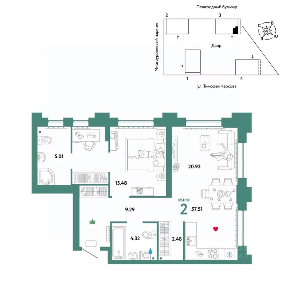 Продается 2комнатная квартира от застройщика "Страна Девелопмент". Стоимость указана без учета акций. Квартира на 17 этаже, площадь квартиры 57,51 кв. м. Сдача — в 3 квартале 2025 года.